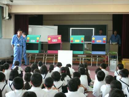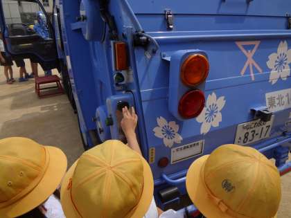 4年生がごみの収集方法や分別などについて学習しました。子ども達はパッカー車の座席に座ったり、ごみを投げ入れたりしていろいろな体験ができました。