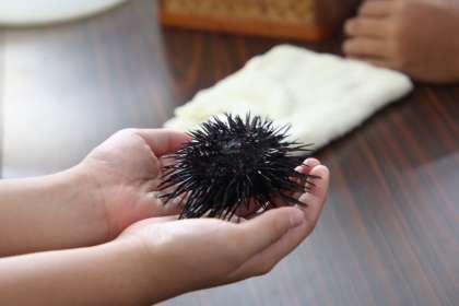 生き物発見教室のようすです。ウニなどの水生生物に触ることや体の仕組みなどについて学習しました。このあとグループ活動で水族館内を見学して、最後にセイウチショーを楽しむ予定です。