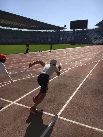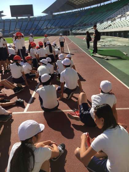 6年生は長居スタジアムに来ています。午前中は100m走と400mリレーをします。午後はサッカーとドッジボールをします。写真は100m走のようすです。