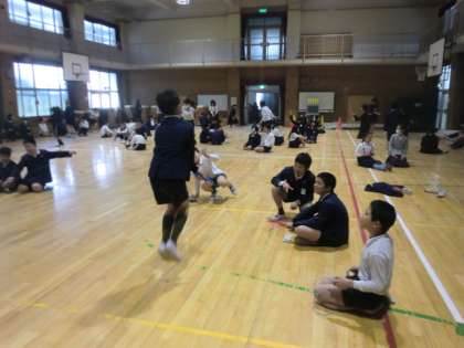 学年ごとになわとび大会を20分休みに行っています。運動委員会児童が学年ごとに指定した技を連続で何回とべるか数えて記録します。これまでの練習の成果が出せたことを喜ぶ姿が多く見られました。写真は4年生のようすです。