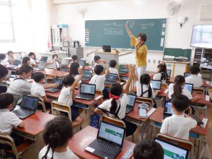 夏休み中に1年生にもタブレット端末が届きました。2組はログインの操作方法を学習しました。少しずつ覚えてどんどん使っていきましょうね。