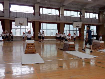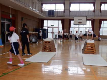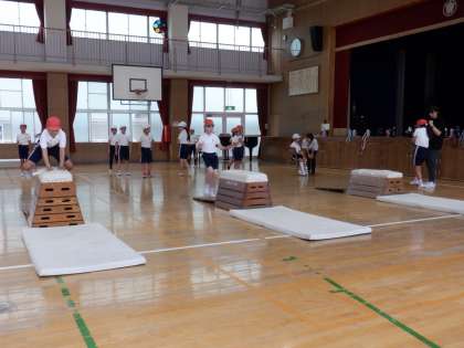 4年生は全クラス、講堂での体育の学習。とびばこに取り組んでいました。助走・踏切・空中姿勢・着地、それぞれのポイントを意識して続けていきましょう。