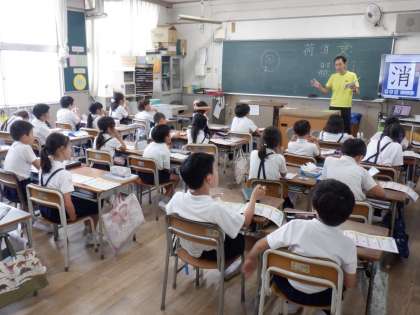 3年1組国語は新出漢字の学習。「受」「消」「荷」の漢字の読み方、使い方、そして書き方を一画一画覚えながら書いていました。「消化」と「消火」、大人でもついまちがえてしまいます。意味をよく考えて使っていきましょうね。