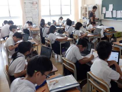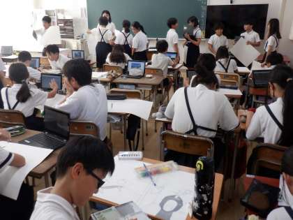 6年生図画工作科は「思い出の三津屋小学校」風景画に取り組んでいます。校舎内外の場所を一人一人が選び、サインペンで線描きし、色を付けていきます。校舎は新しいですが、6年間を思い出しながらていねいに取り組んでほしいです。