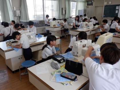 5年1組家庭科の学習はミシンを使って。教え合い、協力し合いながら進めています!