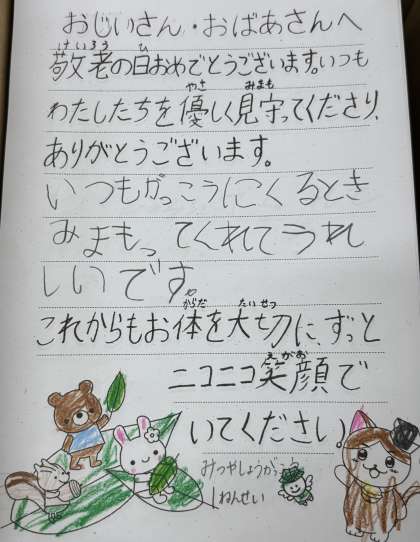 敬老の日おめでとうございます。いつもお世話くださりありがとうございます。三津屋小学校の子どもたちが三津屋地域にお住まいの70歳以上のみなさんにお手紙を書きました。お手元に届きましたでしょうか?子どもたちの感謝の気持ちが伝わったらうれしいです。これからもお元気でご活躍ください。