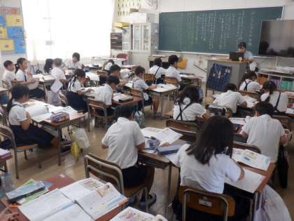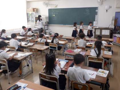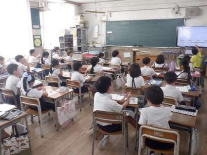 2年4組算数の学習。自分の考えを書いたノートを画面に映しながら、言葉でみんなに説明をしていました。学習が深まります。どんどん発表していきましょう!