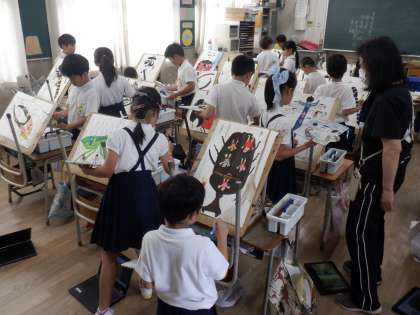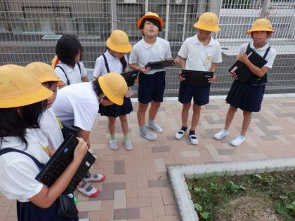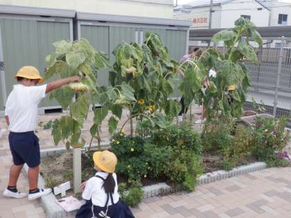 2組理科の学習は学習園に観察へ。種がぎっしり詰まったひまわりを見ていると、イモムシが「こんにちは」と出てきました。図画工作科で取り組んでいる「こん虫」のお礼かな。