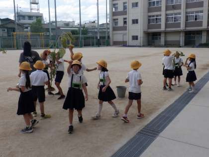 1組の理科の学習で太陽を見に運動場へ。しかし、その時に限って雲が…。太陽が顔を出すのを待ちながら、ひまわりの大きさや根っこの観察をしました。