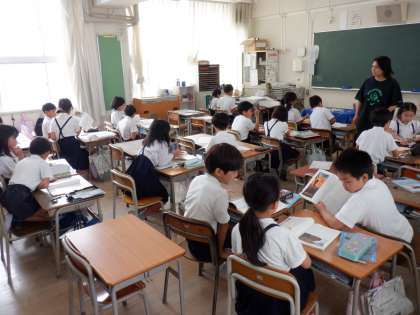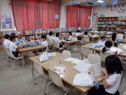 3年4組図書の時間。借りる本を決めた後は、静かに読書タイム。本の世界へいってらっしゃい。