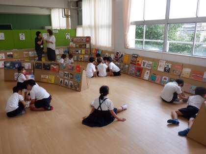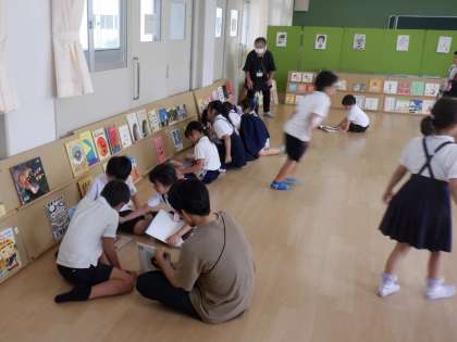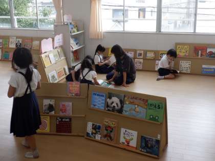おはなしわくわくさんによる「絵本展」が始まりました。今週どこかの時間で全22クラスが参加します。
