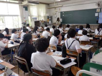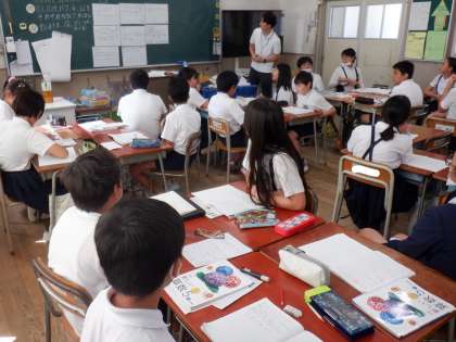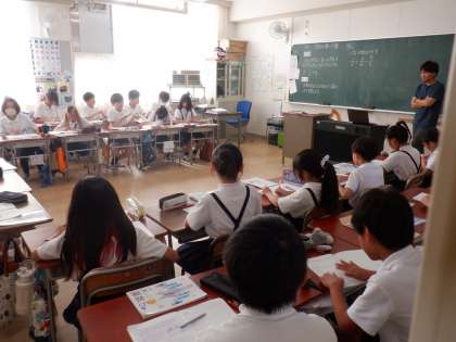 2組算数の学習。小数や整数を分数で表すにはどうすればよいか、グループごとに考えていました。考えた意見を発表し合い、学習を深めていました。