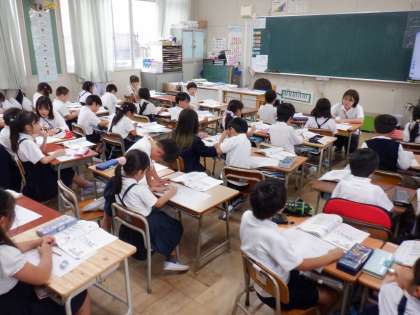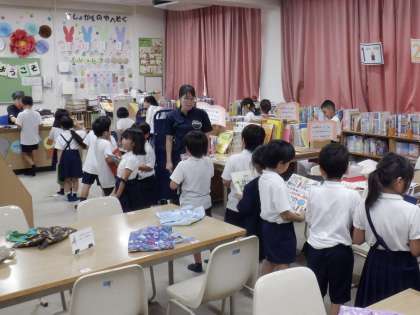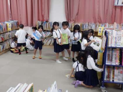 4組図書の時間。返すのも借りるのもカウンターでの処理が必要です。1年生も当たり前のようにルールを守ってできています。すばらしい!自分の読みたい本をどんどん読んでほしいです。