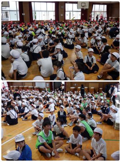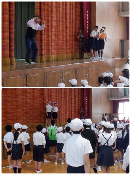 木曜日の朝は児童集会。今日は講堂で「何が通ったでしょうクイズ」でした。舞台上に微妙に空いた空間に何が通ったのか答えるクイズです。