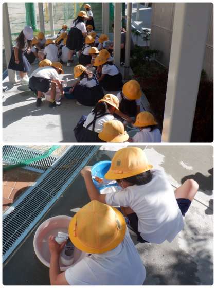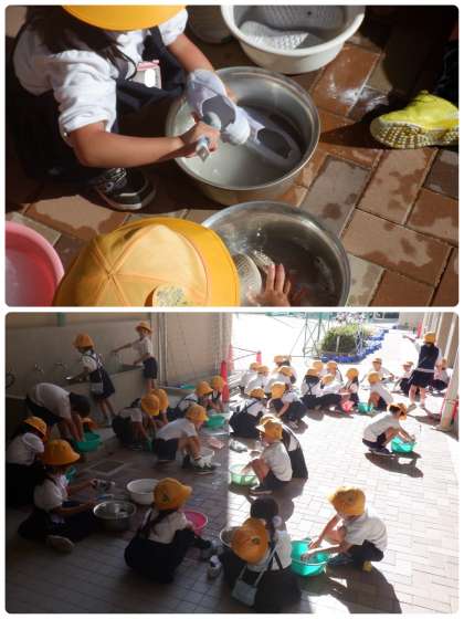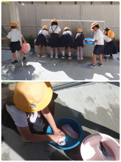 1組2組のみなさんが上ぐつ洗いにチャレンジ!ブラシを使ってゴシゴシと一生懸命に洗っていました。水が濁っているのは汚れが取れた証拠だよ、と言うととてもうれしそうでした。いつも洗ってもらっている人は苦労がわかったかな?