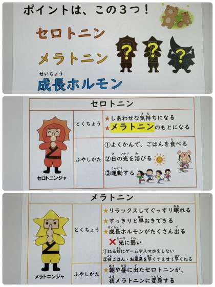学校では「すいみんパワーをたかめよう」の資料を使って、子どもたちに睡眠や食事、運動について学習しました。さらにパワーいっぱいの子どもたちになるようにすすめていきます。