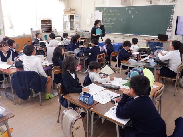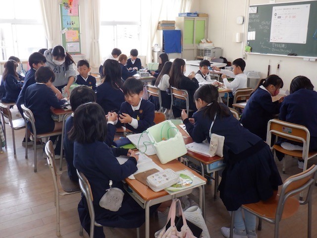 4組理科の学習。「電気を通すもの・通さないもの」を実験を通して調べていました。クリップ、アルミニウムはく、鉄の缶かん、アルミニウム缶、輪ゴム、えんぴつ…、身近にあるいろいろなものを調べていました。どんなものが電気を通したのかな?
