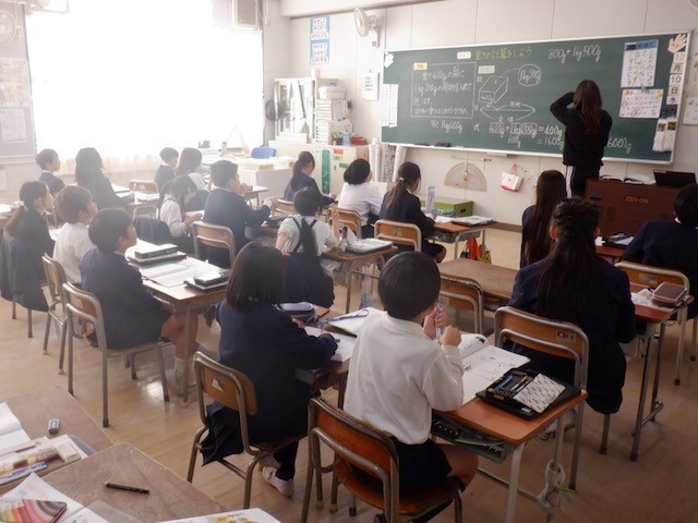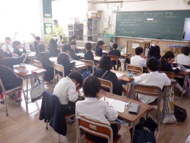 3年生算数は「重さをはかって表そう」の学習。重さの単位と測り方について学習しています。今日の1組と2組の学習は「重さ400gの箱に1kg200gの荷物を入れて送ります。全体の重さはどれだけですか」の問題をみんなで考えていました。単位をそろえることがポイントです。わかったかな?