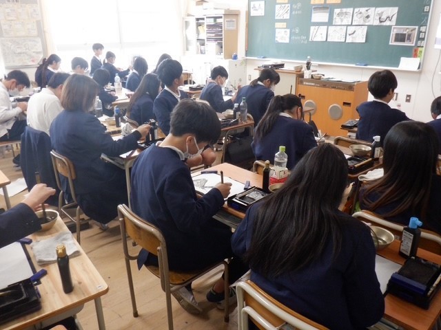 1組は水墨画にチャレンジ。社会科の学習「室町文化」でも出てきた水墨画。どんな作品ができたのかな。