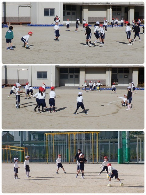 1組体育の学習は「ころがしドッジボール」。当てる方も逃げる方も楽しく活動していました。