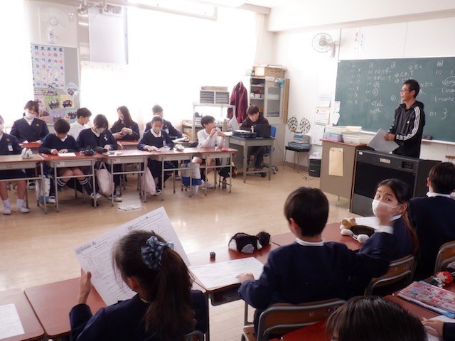 上は2年1組、中は5年2組、下は5年3組の学習のようすです。2年1組算数は「長さをはかろう」の学習。はかった長さのテープと「はい、ポーズ!」。
