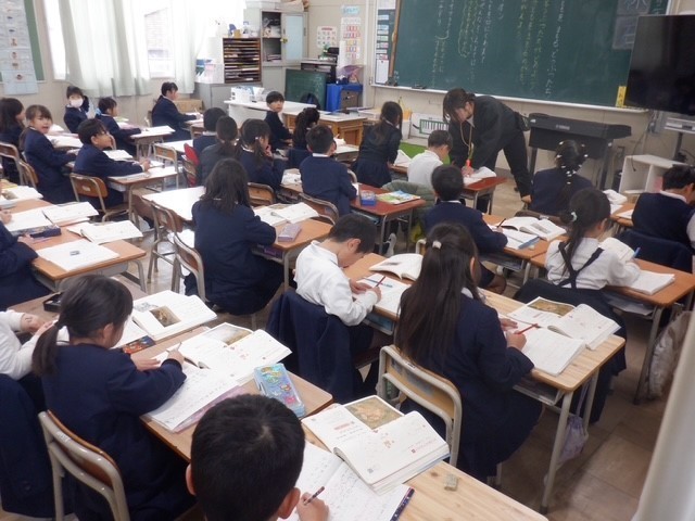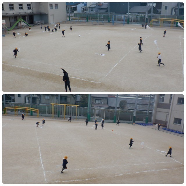 上から1組・3組・4組の学習のようすです。1組と4組はたこあげ。自分が描いた絵を載せた凧が空に舞い上がりました。