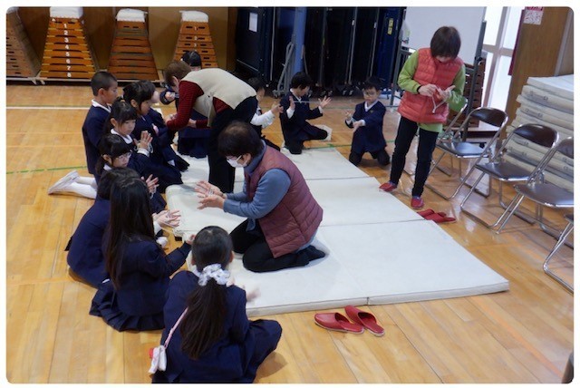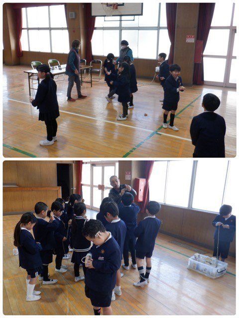 三津屋老人クラブのみなさんをお招きして1年生が昔遊び体験を行いました。「けんだま」「おはじき」「お手だま」「こま回し」「あやとり」の5つの遊びをグループごとに教えていただきました。難しいものもあったようですが、笑顔いっぱい楽しく活動できていました。
