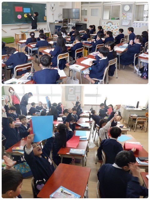 2組算数は「どちらがひろい」の学習。四角形と円、それぞれ大きさの違う2枚の紙をどのようにして比べればいいかをみんなで考えました。