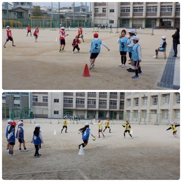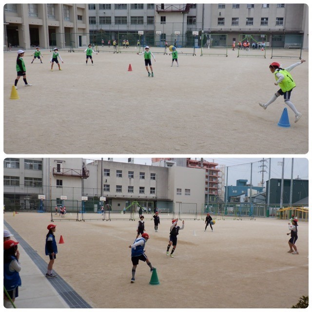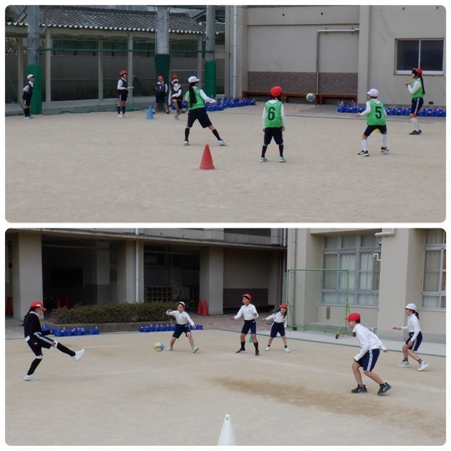 4年生は2クラスずつに分かれて体育の学習「キックベースボール」。守りはボールを取った子の後ろに全員すばやく並べるかがポイントです。今日もチームワークが光っていました。「+1」を押すと、もう1枚写真が見られます。