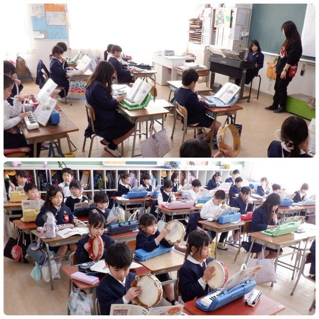 上から1組・2組・3組の学習のようすです。「+1」を押すと、4組の写真が見られます。3組音楽の学習は合奏。自分の担当の楽器をリズムに乗って演奏していました。学習参観もがんばってね。