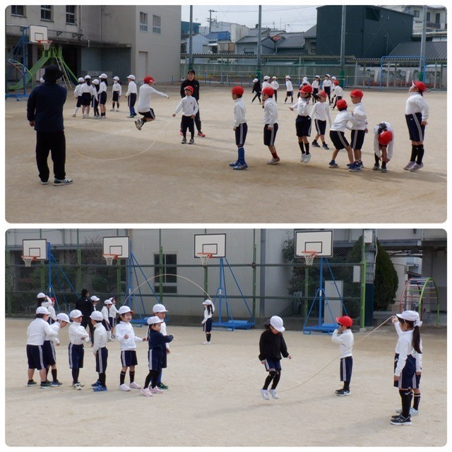 上から1組・2組・3組の学習のようすです。2組体育の学習は大なわとび。楽しく活動していました。