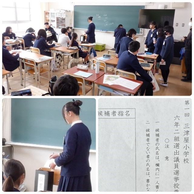 上から6年1組・6年2組・3年3組の学習のようすです。6年2組総合的な学習の時間は学級選出議員選挙投票が行われていました。各議員からの公約に耳を傾け、その中から「この人に託す」と思った議員の名前を書いて投票。さすがは6年生、選ぶ方も選ばれる方も意見をもって活動していました。すばらしい!