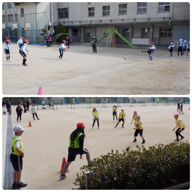 4年1組3組の合同体育の学習「がっちゃんキックベース」を全教員で参観しました。チームごとにめあてを決めて練習し、ゲームスタート。1回表裏が終わったらチームミーティング。そして2回表裏、最後は全員集合してうまくいったことや課題などの全体交流。2クラス合同の学習でしたが、それを感じさせないほど、グループで声をかけ合いながらテキパキと活動していました。すばらしかったです。1組、3組のみなさん、よくがんばりました!
