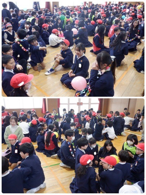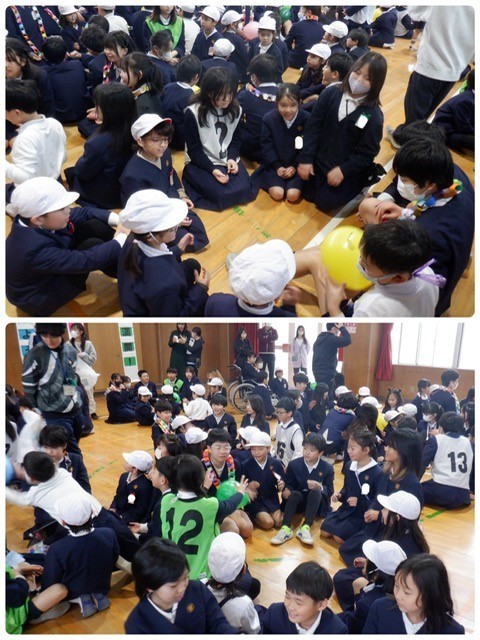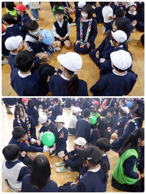 「みんなであそぼう」は爆弾ゲーム。しりとりやマジカルバナナをしながら風船をまわし、曲が止まったときに風船を持っている人がメッセージを伝えます。在校生は6年生に、6年生は在校生に。照れながらも「ありがとう」のメッセージがあふれました。