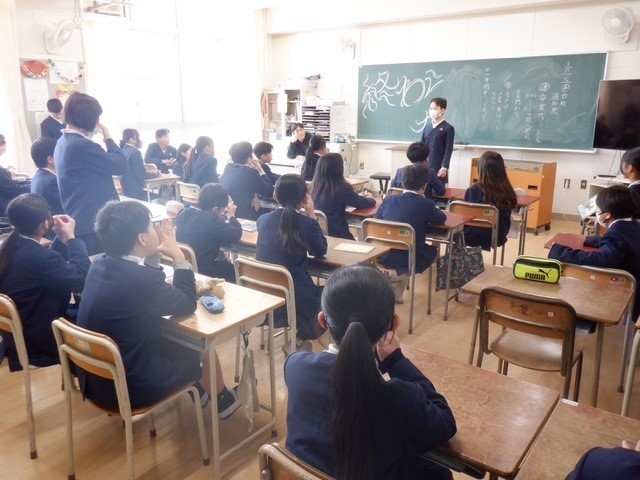 明日に迫った卒業式。学習の最後の時間となる4時間目にそっと見に行くと、、、1組と3組では一人一人がこの1年間を振り返って、友達や先生へ伝えているところでした。卒業式前だというのに、涙、涙。私ももらい泣きしてしまいました。一人一人が最高学年の緊張と責任を感じて過ごしていたんだなぁと改めて。一人一人がしっかりと思いを言葉で伝えていて立派でした。すばらしかったです。2組は「立つ鳥跡を濁さず」中。こちらも思いが伝わってきました。ありがとう!