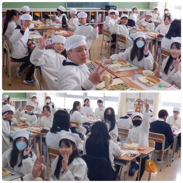 1年間200日登校したとすると、6年間で1200日。遠足のときのお弁当やコロナのときは登校できなかったことを考えると1000食くらいは食べてきた小学校給食。みなさんの体の10分の1くらいは給食が大きくしてくれたのかもしれませんね。それも今日が最後…。最後の「いただきます」、最後の「ごちそうさま」。最後の給食も味わって食べてくれたかな。6年間よく食べて、よくがんばりました。そして、調理員さん、ありがとう!