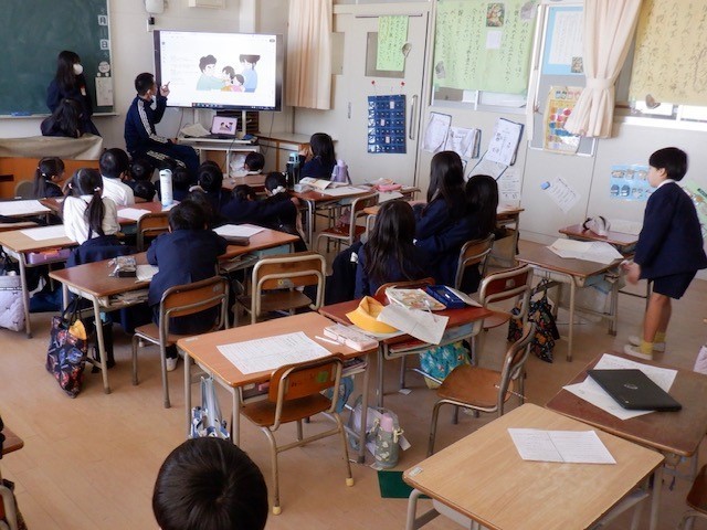 今日3月11日は東日本大震災が起こった日。1組ではモニターを見ながら、みんなで震災について考えました。