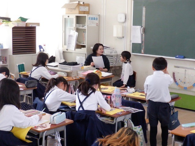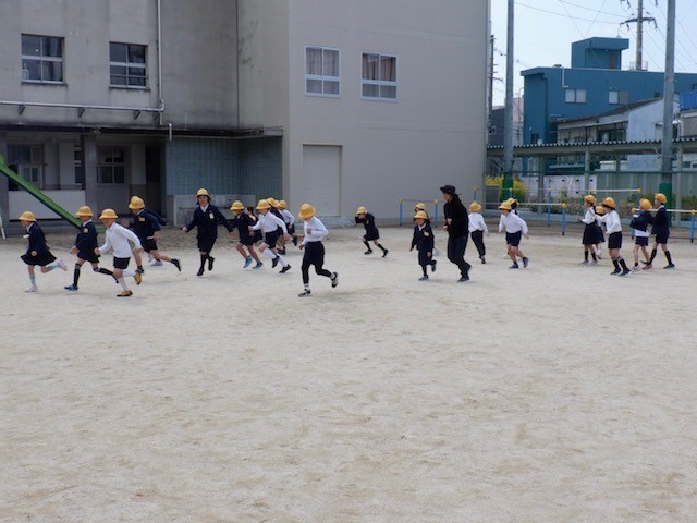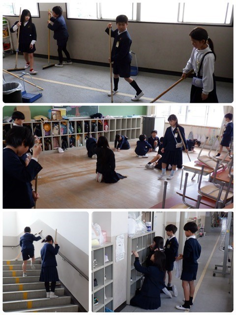 上から2組・3組・4組の学習のようすです。2組は運動場で楽しく遊び、4組はピカピカ大作戦、3組は通知表を渡しているところでした。