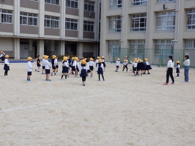 上から1年4組・2年1組・2組の学習のようすです。1年4組は運動場で遊び、2年1組は大そうじ、2組は通知表を渡しているところでした。