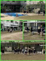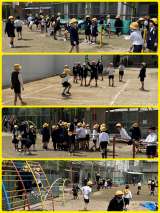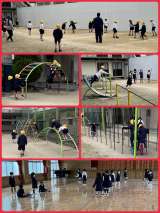 6年1組が運動場で体育の学習。いい天気の中、楽しみながら体を動かしていました。...