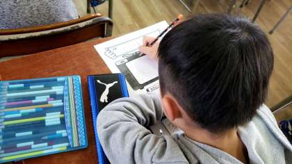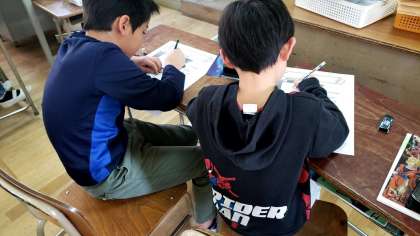 自己紹介カードを作っていました。 自分の似顔絵 得意なこと 苦手なこと等