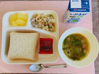 【食パン、いちごジャム、マカロニグラタン、レタスのスープ、りんご(カット缶)、牛乳】