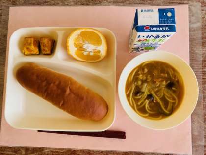 【黒糖パン、カレースープスパゲッティ、焼きかぼちゃ、あまなつかん、牛乳】
