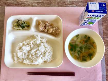 【鶏肉のからあげ、中華スープ、チンゲンサイともやしの甘酢あえ、ごはん、牛乳】