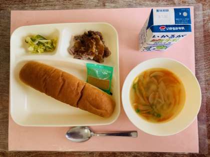 【大型コッペパン、りんごジャム、豚肉のデミグラスソース、スープ、キャベツとピーマンのソテー、牛乳】