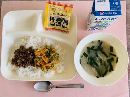 ビビンバは、韓国・朝鮮の料理です。春と秋の年2回登場するメニューです。牛ひき肉、豚ひき肉をにんにくと一緒に炒めて味つけしたものと、ゆでた切り干しだいこん、蒸したきゅうりとにんじんを味付けしたものを、ごはんに乗せて、食べる時に混ぜていただきます。