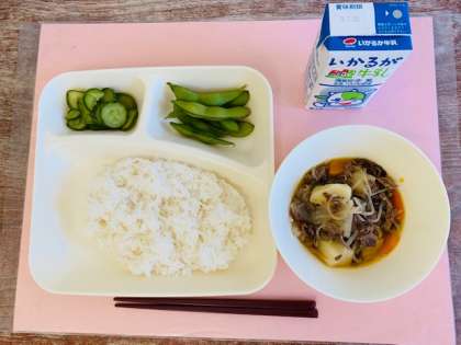【ごはん、肉じゃが、きゅうりのかつお梅風味、えだまめ、牛乳】