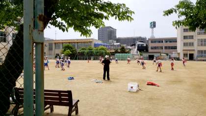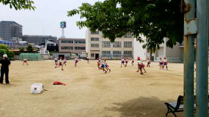 赤と白に分かれてしっぽ取りゲーム。右へ左へ、前や後ろに かなりの運動量です!