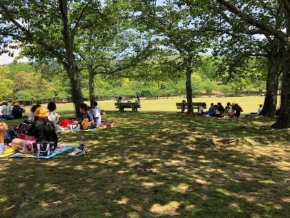 暑い中ですが、緑がきれいな広場で日影を見つけてお弁当を食べました。気持ちのいい景色です。
