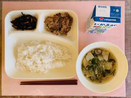 【ごはん、豚肉のごまだれ焼き、五目汁、ひじきのいため煮、牛乳】
